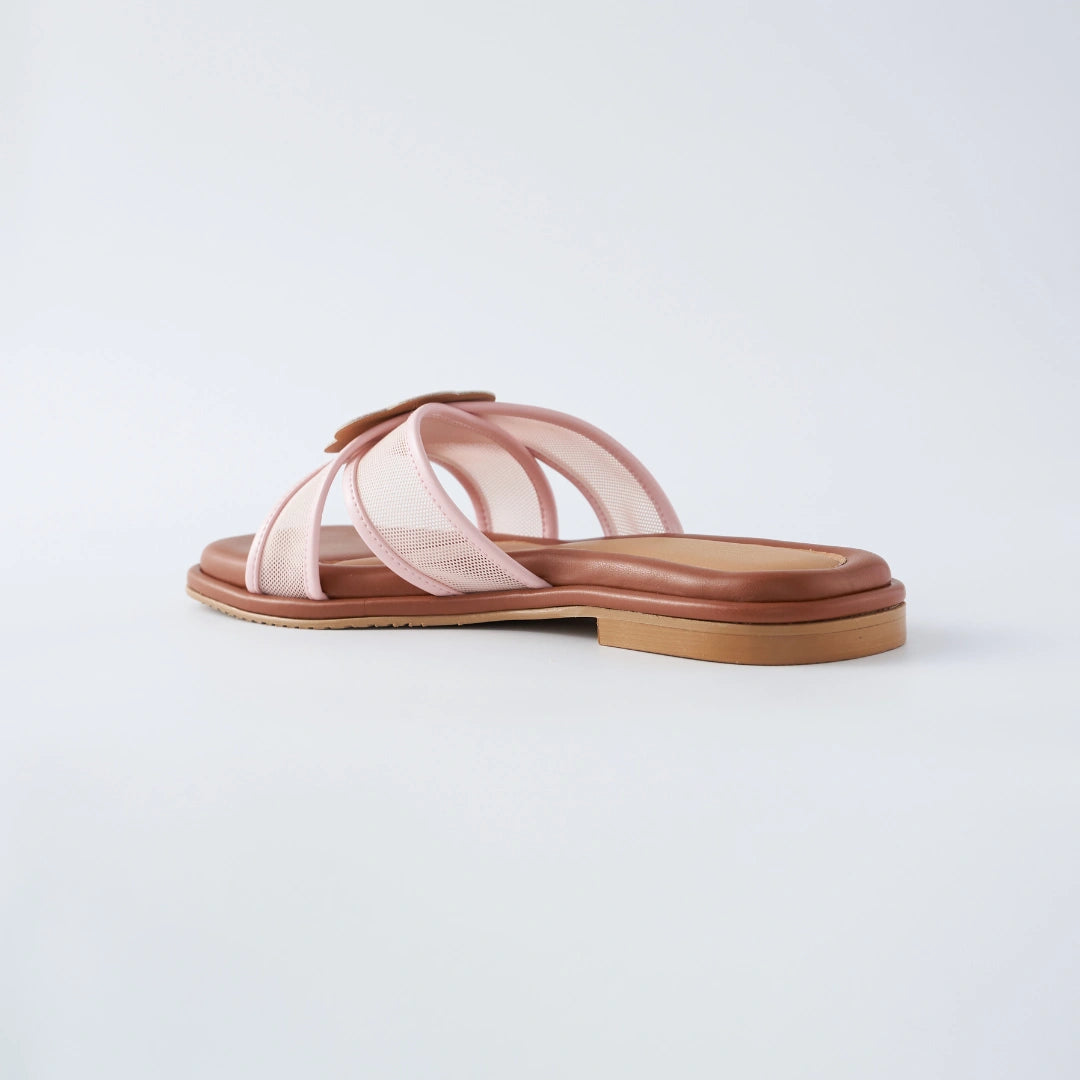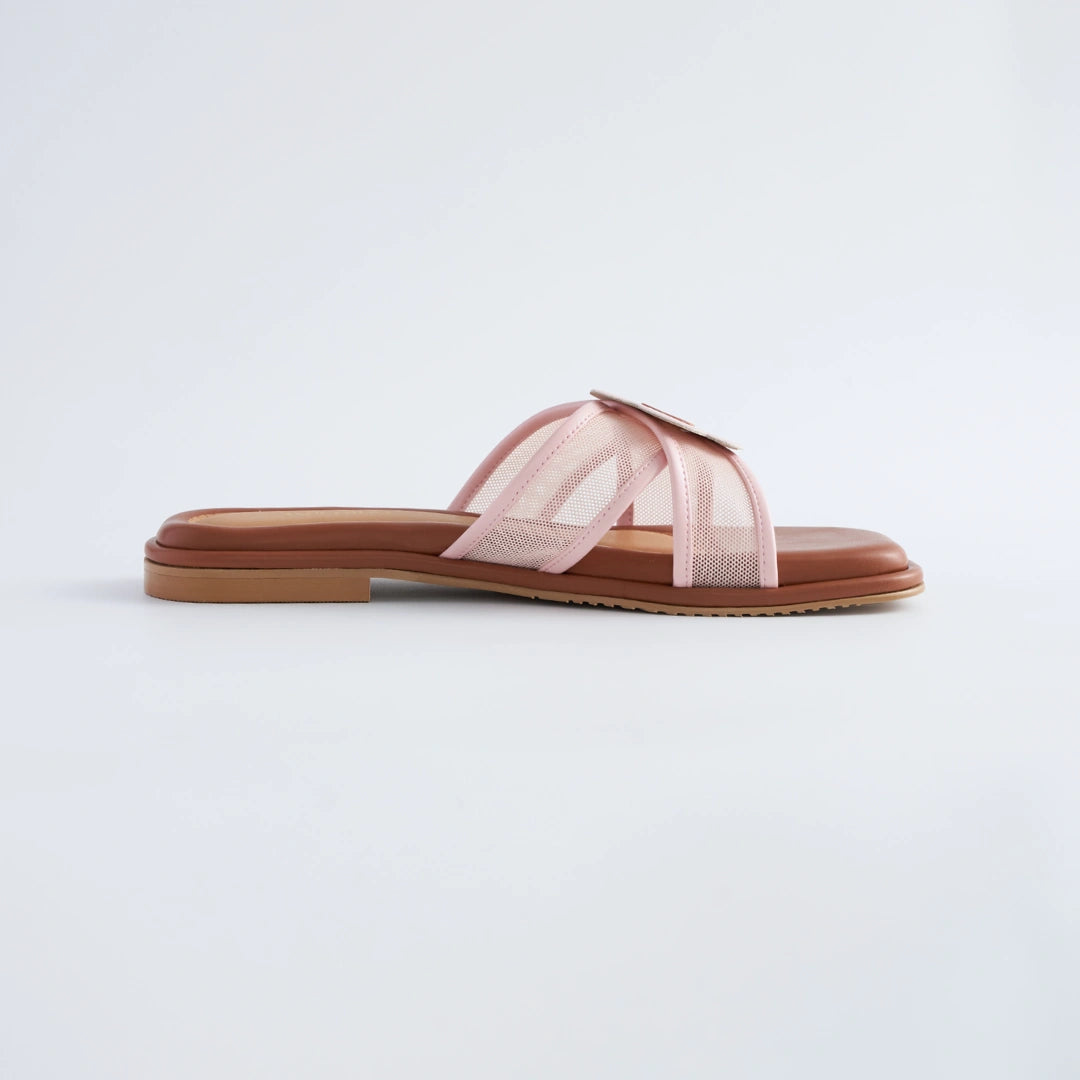 Perfect for pink lovers, this sweet hue on the mesh cross straps brings a playful touch to any casual look. Whether you're strolling along the beach, grabbing your favorite weekend coffee, or heading out for a relaxed day with friends, these slip-on sandals add just the right pop of color. Set on a warm brown base, they’re comfortable, easy to style, and effortlessly chic! Your go-to flats you'll find yourself reaching for again and again.
