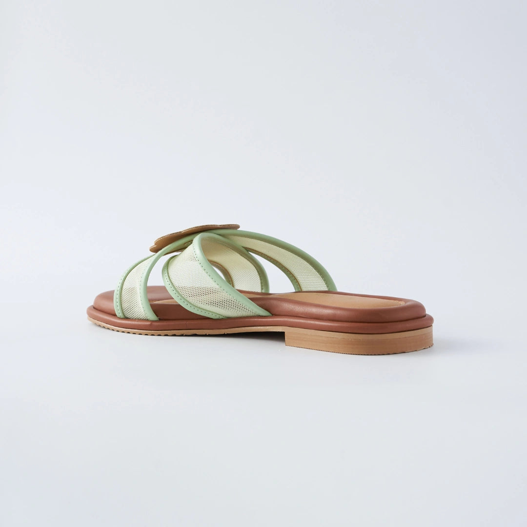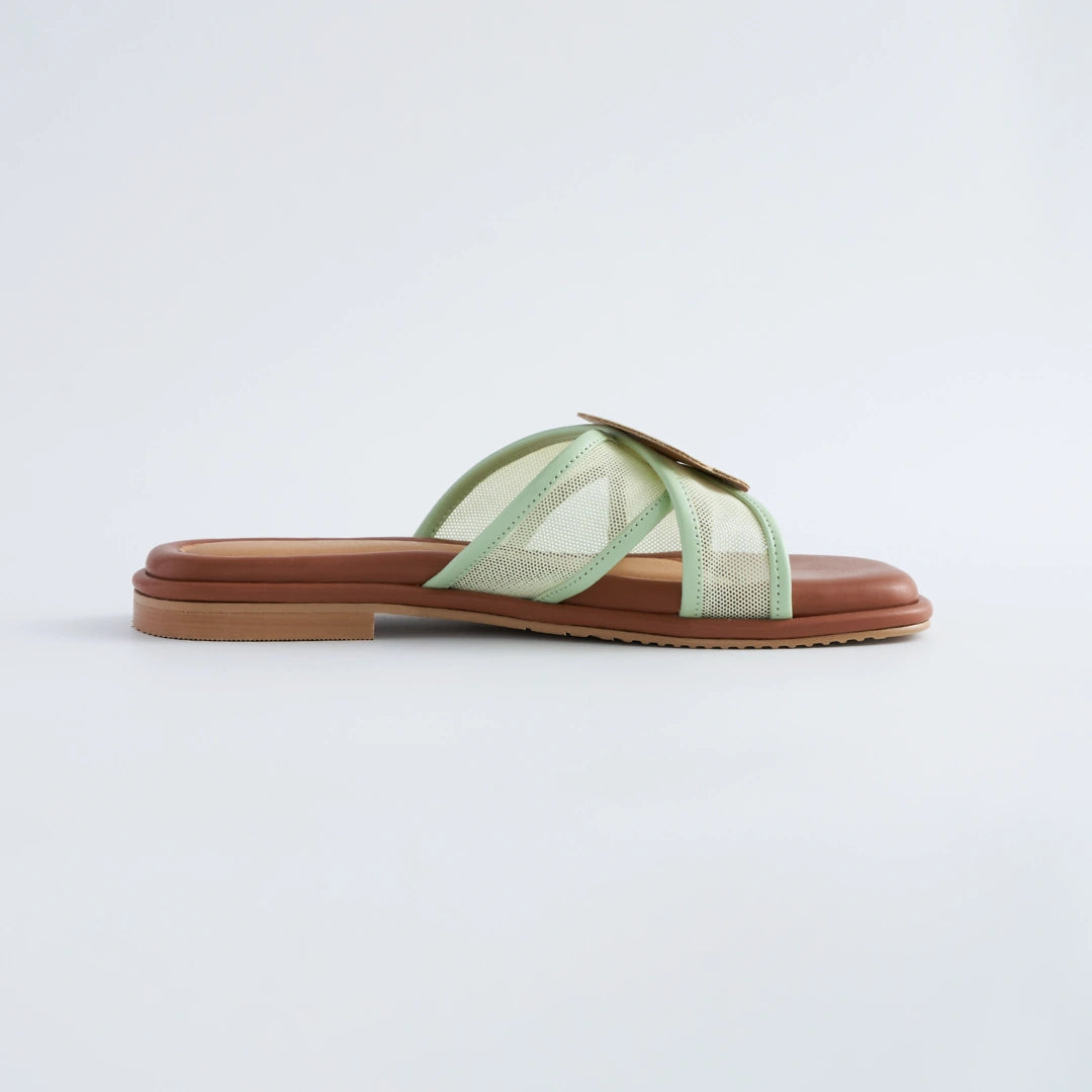 Featuring breathable mesh cross straps in a soft sage green, this pair pops beautifully against the warm brown sole—creating a soothing yet playful contrast. Whether you're pairing them with a minimalist outfit or adding a subtle statement to your day, these comfortable sandals for women deliver just the right blend of style, color, and relaxed elegance.