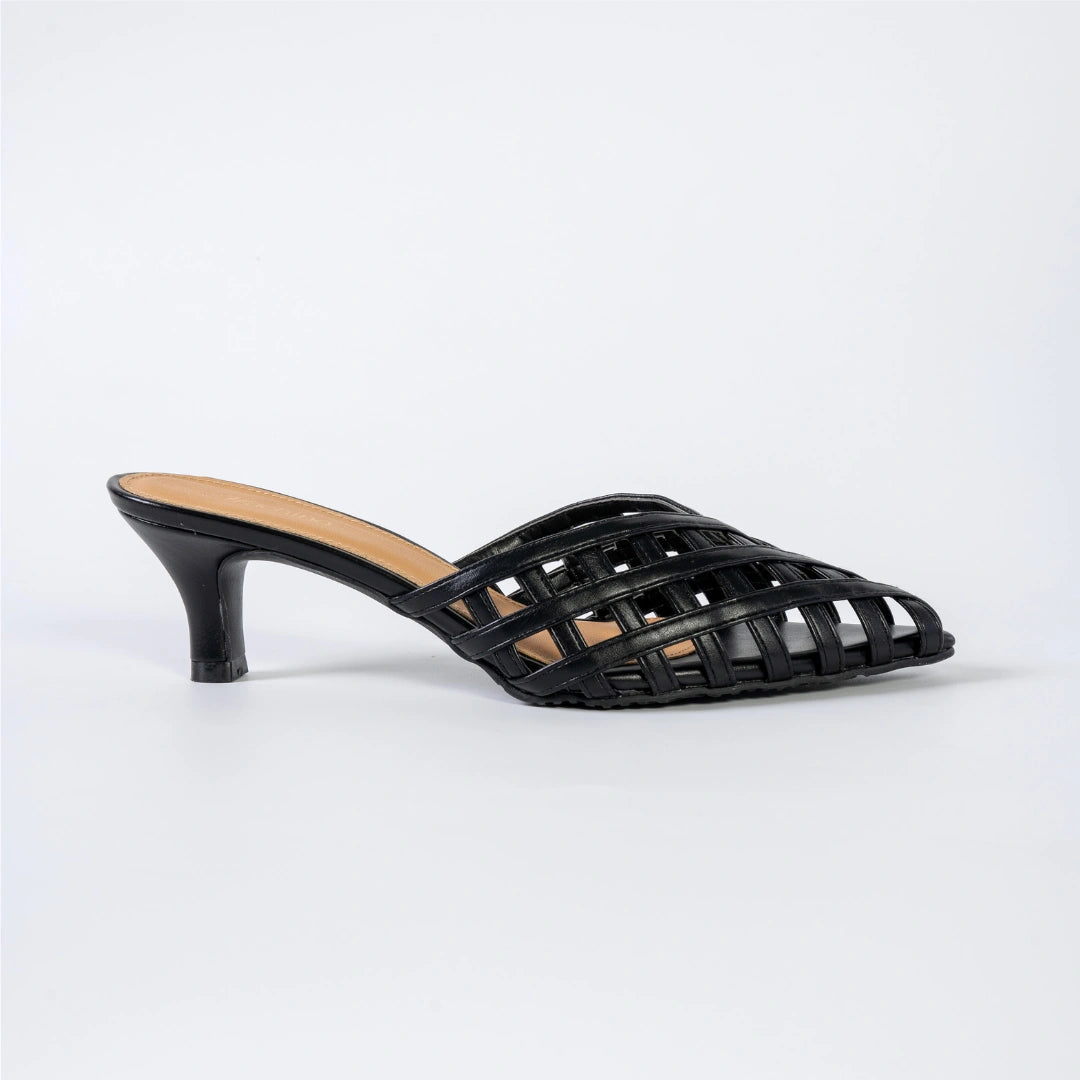 Step out in style with Machino's Stripe Mules in Black, a modern twist on classic mules. Featuring a unique lattice strap design, these pointed-toe mules provide a sophisticated, breathable style ideal for warmer days. The mid, comfortable heel adds just the right amount of lift, making them perfect for both office wear and evening outings. The Stripe Mules offer lasting comfort and style, pairing seamlessly with tailored pants, skirts, or dresses.