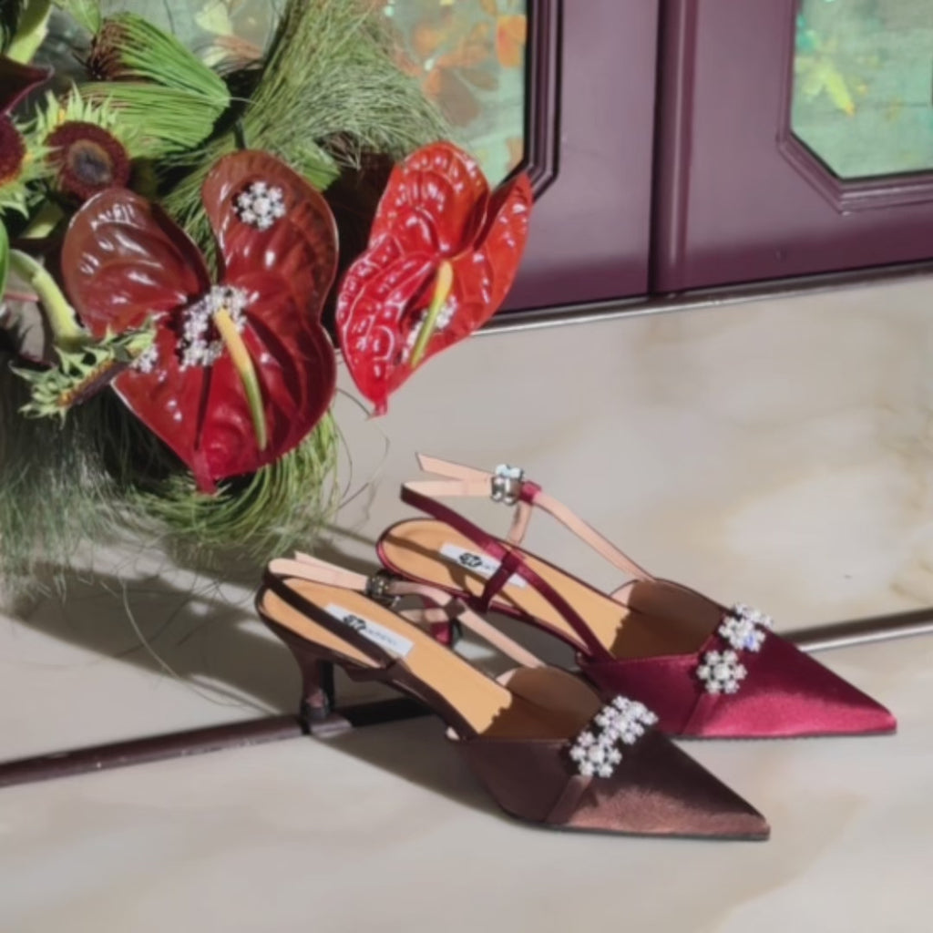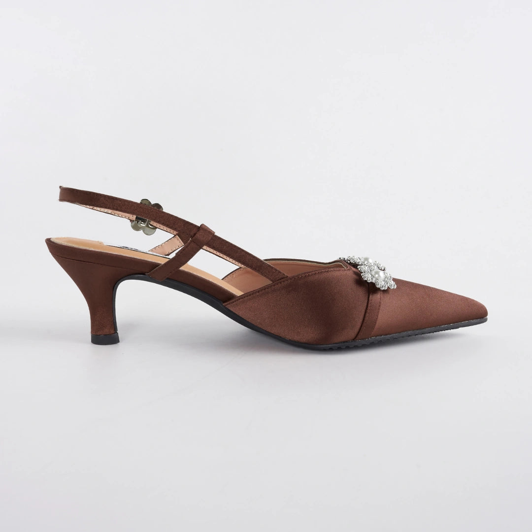 Part of The Mac Gala, a Raya collection inspired by graceful evenings, refined details, and timeless femininity. The Pearl Slingback Heels in Jewel Espresso feature a rich satin finish paired with Hana jewel embellishment and a delicate Hana buckle detail, bringing together softness and sophistication in a classic silhouette.