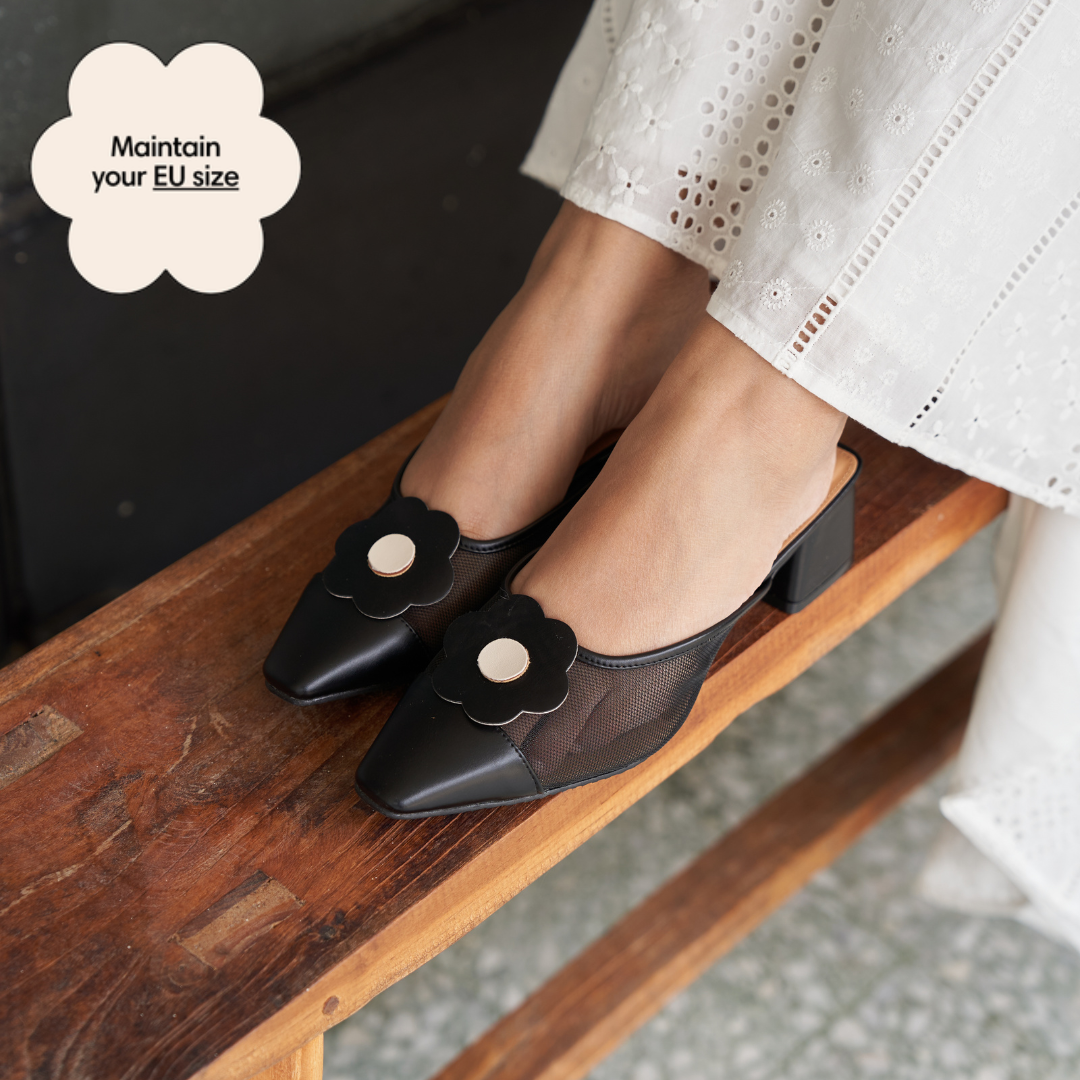 Mesh fabric, paired with a block heel and slim pointed toe front alongside our iconic 6-petal Hana flower? Say less, Moment Mules in Hana Blush are the MOMENT! Ladies, you'll look fabulous walking around the city this Raya season with a pair of Moment Mules. Wrapped in a mature deep black shade, these slip-on mules exudes a feeling of elegant and fashionable. Pair this chic slides with your best Raya outfit for a style and comfort!