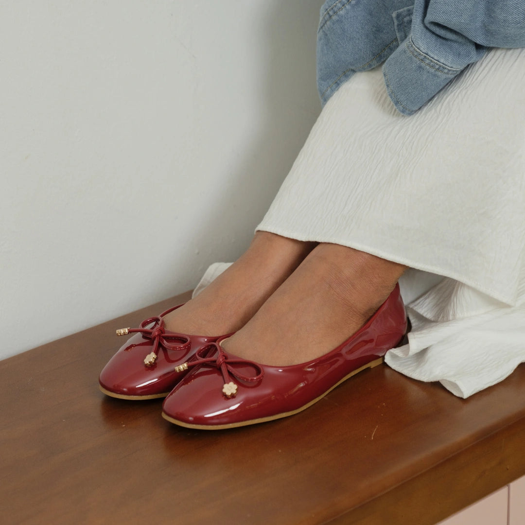 Rich, feminine, and quietly striking. The Classic Ballerina Flats in Glossy Maroon brings depth and elegance to a timeless silhouette, finished in a smooth patent glossy texture for a refined, elevated look.