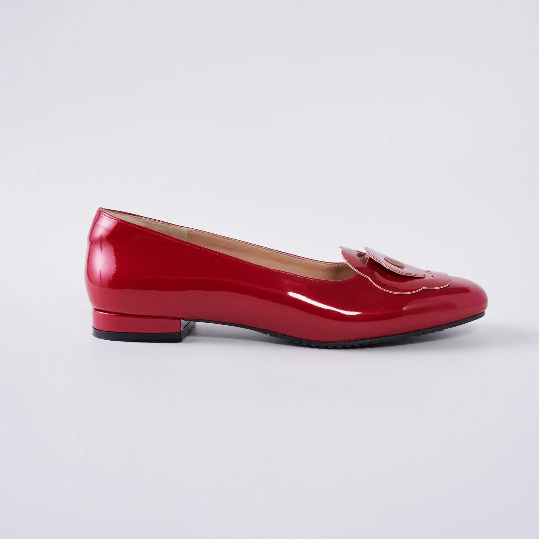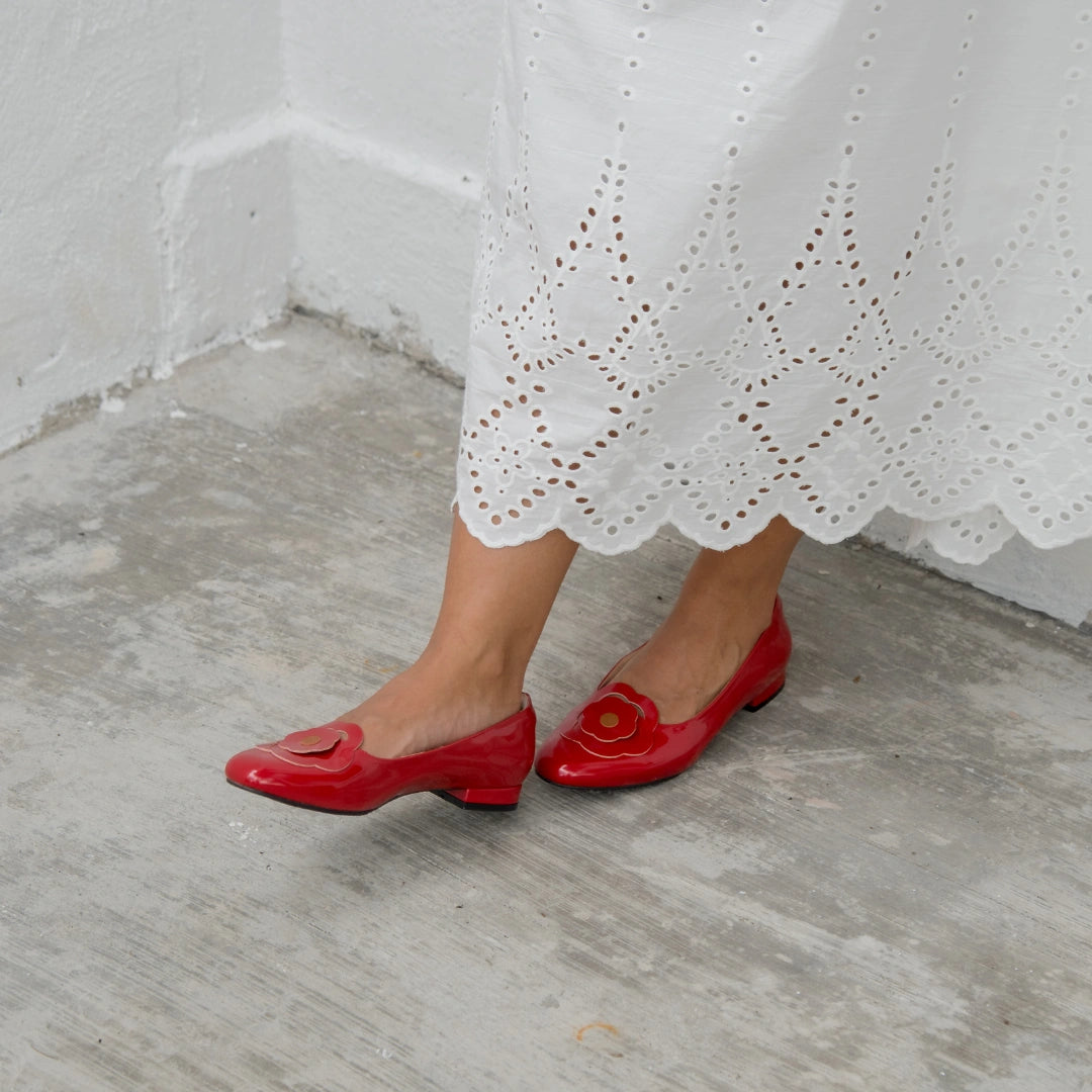 Bold, feminine, and effortlessly chic. The Bloom Ballerina Flats in Hana Red are crafted in a glossy red finish that instantly elevates your look. Fully covered with a sleek silhouette, this pair is finished with our iconic 6-petal Hana flower for a polished Machino signature.