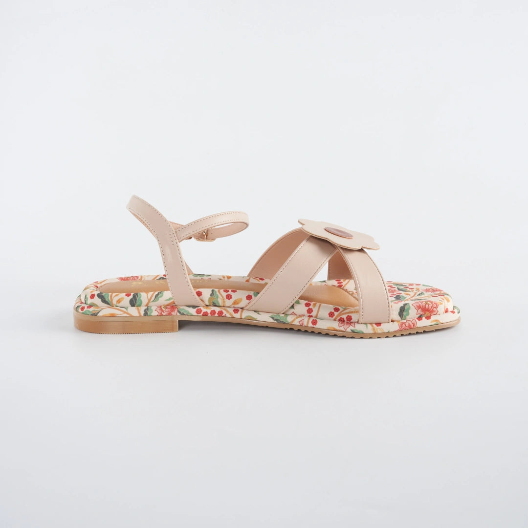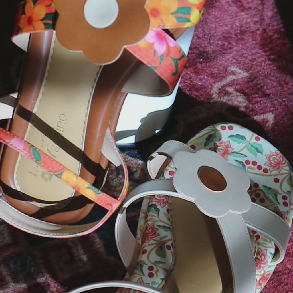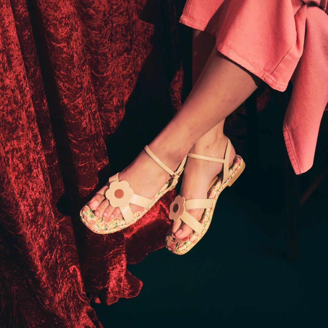 Soft, airy, and beautifully versatile. Harmony Flats in Amber Cream showcases a lighter interpretation of Bayu Somerset’s floral heritage print, blending delicate florals with a clean, feminine palette. The PU Hana flower detail on the front strap brings a playful yet recognisable Machino touch, while the adjustable ankle strap offers stability and ease with every step.